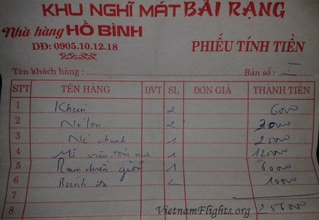 Bill. Summ of your bill can be count according some new mathematic rules. And almost never in less side! 6+3+25+125+60+10 = 229.000 Somewhere lost 27.000 dong!